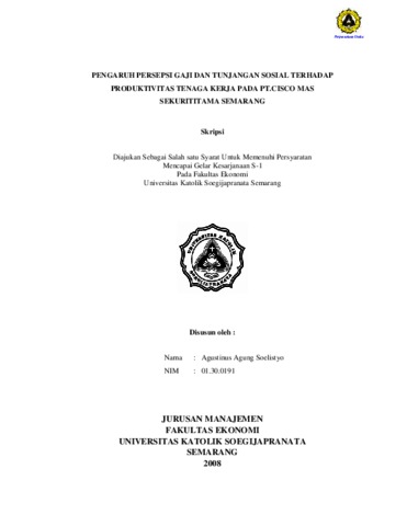 Soelistyo, Agustinus Agung (2008) PENGARUH PERSEPSI GAJI DAN TUNJANGAN SOSIAL TERHADAP PRODUKTIVITAS TENAGA KERJA PADA PT.CISCO MAS SEKURITITAMA SEMARANG. Other thesis, Prodi Manajemen Unika Soegijpranata.