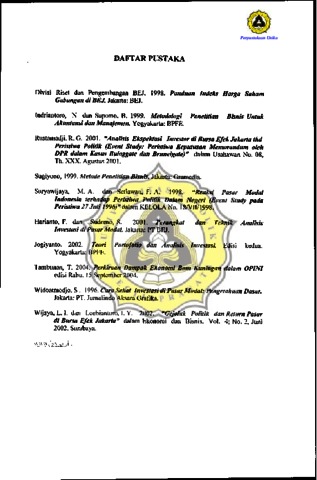 Agustine, Fanny (2005) ANALISIS EKSPEKTASI INVESTOR DI BURSA EFEK JAKARTA TERHADAP PERISTIWA BOM KUNINGAN 9 SEPTEMBER 2004 DI JAKARTA. Other thesis, Prodi Manajemen Unika Soegijpranata.