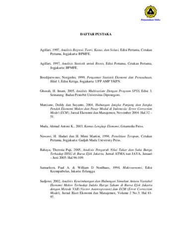 Dimas, Antonius (2009) ANALISIS PENGARUH NILAI TUKAR, TINGKAT SUKU BUNGA SBI DAN TINGKAT INFLASI TERHADAP INDEKS HARGA SAHAM GABUNGAN (IHSG) DI BURSA EFEK JAKARTA (BEJ) (PERIODE TAHUN 2001-2006). Other thesis, Prodi Manajemen Unika Soegijpranata.