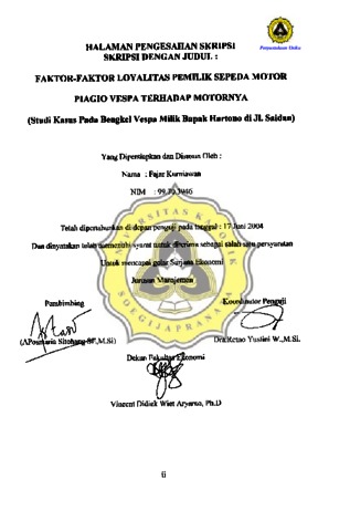KURNIAWAN, FAJAR (2004) FAKTOR-FAKTOR LOYALITAS PEMILIK SEPEDA MOTOR PIAGIO VESPA TERHADAP MOTORNYA (STUDI KASUS PADA BENGKEL VESPA MILIK BAPAK HARTONO DI JL. SAIDAN). Other thesis, Prodi Manajemen Unika Soegijapranata.