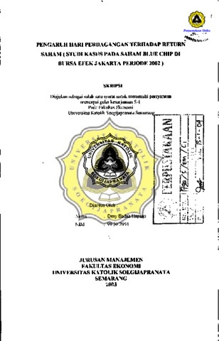 HAPSARI, DESY ENDAH (2003) PENGARUH HARI PERDAGANGAN TERHADAP RETURN SAHAM (STUDI KASUS PADA SAHAM BLUE CHIP DI BURSA EFEK JAKARTA PERIODE 2002). Other thesis, Prodi Manajemen Unika Soegijapranata.