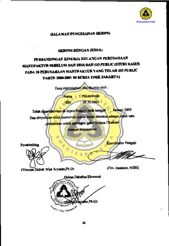 PRIYAMBODO, - (2005) PERBANDINGAN KINERJA KEUANGAN PERUSAHAAN MANUFAKTUR SEBELUM DAN SESUDAH GO PUBLIC (STUDI KASUS PADA 20 PERUSAHAAN MANUFAKTUR YANG TELAH GO PUBLIC TAHUN 2000-2001 DI BURSA EFEK JAKARTA). Other thesis, Prodi Manajemen Unika Soegijapranata.