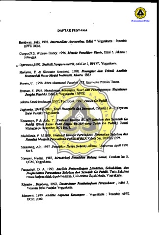 Perusahaan Manufaktur mempunyai peranan penting dalam perekonomian Indonesia sebagai suatu komponen penting dalam pertumbuhan ekonomi, dan mengupayakan pemerataan hasil pembangunan serta sebagai tumpuan pemerintah untuk membayar cicilan dan hutang luar negeri. Privatisasi adalah salah satu jalan keluar dalam memecahkan masalah ekonomi Indonesia serta lebih efektif dan lebih efisien. Dipakainya Perusahaan Manufaktur karena sahamnya lebih dari 500/0 di BEJ. Salah satu altematif yang dapat dilakukan oleh suatu perusahaan untuk mendapatkan dana dan modal yang akan digynakan untuk mengembangkan usahanya adalah dengan cara go publik yaitu dengan encatatkan sahamnya di pasar modal. Maka dengan cara ini perusahaaa a-k-an mehdapatka a segar dengan biaya yang relatif murah dari masyarakat. Kinerja keuangan perusahaan dapat diukur dengan berbagai cara. Salah satunya adalah dengan menggunakan. asio-rasio. Dipilihn a rasio-rasio untuk pengukuran kinerja keuangan perusahaan dalam penel'tianini tlikarenakan analisis rasio yang paling nyak digunakan. Rasio dirancan untuK memperlihatkan hubungan antara tkiraan-perkiraan laporan euangan. Berdas fan k terangan diata~, aka yang menjadi permasalahannya adalah "apakah terdawat perBedaan };ang siptifikan antara kinerja perusahaan sebelwn dan sesudah go publjk ?" Objek ya digunaKan dalam penelitian ini adalah Perusah n Manufaktur yang telah go publ'K dan tercatat di Bursa Efek akarta pada tahun 2000-2001 yang telah melaporkan l,\~oran keua gannya inimal 2 tahun sebel an sesudah go publik, dengan penI bangan oahwa pengaruh pen gunaan dana hasil penjualan saham perdana akan e inat pengarulmy-a dan tampak dalam laporan keuangan untuk tahun-tahun beriku. n a. Dan terda~at 20 Perusahaan Manufaktur yang telah listing di Bursa Efek Jakafita, dan 20 perusahaan itu dalal : PT.Alfa Retailindo (ALFA) Tbk, PT.Tunas Bam Eampu g (TSLA) TrbK, T.Sarya Intirindo Makmur (SIMM) Tbk, PT.Asiaplast Industries (~ Tbk, PT.Fortune Mate Indonesia (FMII) Tbk, PT. Summitplast Interbenua (SMPL) Tbk, PT. Rimo Catur Lestari (RIMO) Tbk, PT. Andhi Chandra Automotive (ACAP) Tbk, PT. Plastpack Prima Industry (PLAS) Tbk, PT. Indofarma (INAF) Tbk, PT. Daeyu Orchid Indonesia (DOID) Tbk, PT. Kimia Farma (KAEF) Tbk, PT. Lapindo Packaging (LAPD) Tbk, PT. Arwana Citra Mulia (ARNA) Tbk, PT. Betonjaya Manunggal (BTON) Tbk, PT. Metamedia Technologies (META) Tbk, PT. Akbar Indo Makmur Stimec (AIMS) Tbk, PT. Pyridam Farma (PYFA) Tbk, PT. Ryane Adibusana (RYAN) Tbk, PT. Colorpack Indonesia (CLPI) Tbk. Hipotesis dalam penelitian ini digunakan untuk menguji apakah terdapat perbedaan pada kinerja keuangan perusahaan sebelum dan sesudah go publik baik secara parsial maupun secara bersama-sama. Hipotesis tersebut dirumuskan sebagai berikut: Hipotesis Ho : tidak terjadi peningkatan yang signifikan terhadap kinerja keuangan Perusahaan Manufaktur antara masa sebelum IPO dan sesudah IPO yang diukur melalui rasio keuangan. Hipotesis Hi : terjadi peningkatan yang signifikan terhadap kinerja keuangan Perusahaan Manufaktur antara masa sebelum IPO dan sesudah IPO yang diukur melalui rasio keuangan. Tujuan dari penelitian ini adalah untuk menguji apakah ada perbedaan yang signifikan kinerja keuangan perusahaan sebelum dan sesudah go public. Setelah tujuan penelitian diatas tercapai peneliti b h rap agar basil penelitian ini dapat bermanfaat bagi berbagai pihak se~ni : emiten , investor, dan pembaca. Penelitian di mulai (fengan melakukan perfiinmgan untuk mengetahui besamya ROA ( Return On Asset), ROE (Return On Equily), GPM (Gross Profit Margin), NPM (Net Pr.ofit Margin 1," QP (O/Terating Profit Margin), Total Asset Turn Over (TAT) dari rt)asing-masing emiten. Rasio-rasio keuanga perusahaan yang digunakan sebagai Basar pengukuran kineda keuangan perusahaan kemudian dianalisa dengan menggunakan uji perin~a ertanda Wilcoxon un ' mengetahui ada tidaknya perbeaaan kine ja keuangan aat sebelum dan sesudah g~ publik. Hasil pengujian peringkat DertandA Wilcoxon ehunjrikan hasil ROA ( O,O~ ), ROE ( 0,007 ), GPM ( 0,002 ), M ( 0,031 ), OPM ( 0,0115 ), TAT (0,0015 ). 'Ni 'f1Ii-nilai tersebut temyata lebih ke i jika dibandingkan dengan nil~i t tabel yaitu (1,V29). Hal ini berarti secara parsirH semua variabel tidak mempunyai perbedaan ~ang signifikan antara sebelum dan sesudah go l1ub1ik. Berdasarkan asil pengujian hip'o e is ' baik dengan enggunakan uji peringkat bertanda Wilcoxon maupUH uji tandamaka dapat aisim ulkan bahwa tidak terdapat perbedaan yang -s~gnifikan antara kinerja keuangan berdasarkan rasio keuangan untuk tahun-tahu sebe1um dan sesudah go pubtik. Maka dari kesimpulan tersebut penulis memberikan e5erapa saran ya' tu: erusa aan Manufaktur lebih sadar biaya dan memegang prinsip enterpreneuFship, privatisasi dipersiapkan lebih matang untuk masing masing kondisi Perusahaan Manufaktur, peroleban dana penjualan perdana dimanfaatkan secara optimal.