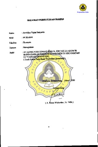 SURYANTO, ARIVIDYA YAJNA (2005) ANALISIS POSITIONING ROKOK KRETEK DJARUM 76 BERDASARKAN PERSEPSI KONSUMEN DI KECAMATAN GAYAMSARI SEMARANG (STUDI KASUS PADA PASAR GAYAMSARI SEMARANG). Other thesis, Prodi Manajemen Unika Soegijapranata.