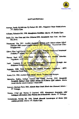 Dalam dunia usaha hampir semua investasi mengandung unsur ketidakpastian atau risiko (risk). Risiko ditaksir sebagai kemungkinan keuntungan sebenamya yang menyimpang dari keuntungan yang diharapkan. Pada dasamya keputusan investasi menyangkut masalah pengelolaan dana pada suatu peri ode tertentu, dimana para investor mempunyai harapan untuk memperoleh pendapatan atau keuntungan dari dana yang diinvestasikan selama periode waktu tersebut. Para investor akan selalu berusaha untuk meneari strategi yang sedemikian rupa sehingga untuk suatu risiko tertentu memperoleh keuntungan yang maksimum. Dalam portofolio risiko dapat dikurangi dengan cara diversifikasi, dimana diversifikasi portofolio meupakan pengkombinasian berbagai saham dalam in¥estasi guna mencapai hasil yang optimal. Dengan diversifikasi portofolio diharap . risuko yang ditanggung suatu investasi akn lebih kecil dibanding Ji a in¥estor mengiavestasikan dananya paa saham individual. Obyek peneli ia fni meng~nakan",saham lode LQ-45 karena memiliki nilai likuiditas tinggi, frekuensi perdagangan ~ang ting!,ri se prospek pertumbuhan yang baik. Tujuan yang lOgin dicapai melalaui penelitian ini ae"lah untuk mengetahui komposisi portofolio yang optimal pada sahain yang tetmasuk a Indeks LQ-45. Dari seluruh s am yan masuk dal~ nde,ks LQ-4'S selama ~Fiode Agustus 2000 sampai deng~n Januan 2003 diambil sahain-saham yang tems muncul, didapat 25 saham sebagai pel. I engan menggun' data harga 'Sah~ penutupan secara mingguan dan data pengpmuman mbagtan de iden diperole return realisasi. Dengan mengguna n Me n J.{ariqnce Model, return re lisasi tersebut diolah dan menghasilkan retu ekspeldasi dan staDOart Cieviasi mas' ng-masi g saham, koefisien korelasi antar saba return iJan standart deviasi portofolio dam roporsi dana yang harus ditanamkan dalam portofolio optimal ersebut.,<f)ari 25 s m yang digunakan sebagai sam pel temya hanya a~ lOs am :yang masuk dalam portofolio optimal, yang kemudian saham-saha tersebut akan dijadikan kandi t sebagai alat pemilihan altematifportofolio yang la' . HasH akhir dari penelittan i i menglJasilkan 6 altethatif pemilihan termasuk portofolio optimal. Dari sejumlah altematif yang ditawarkan tersebut kesemuanaya dapat dijadikan altematif penanaman dana bagi investor. Pemilihan altematif yang tepat disesuaikan dengan sifat (preferensi) investor, yaitu : t. Untuk investor yang menyukai risiko atau risk seeker akan memilih saham yang mempunyai keuntungan yang lebih besar meskipun risiko yang ditanggung juga besar, yaitu portofolio yang terdiri dari saham MEDC dan TSPC dapat digunakan sebagai altematif pilihan. 2. Untuk investor yang tidak menyukai risiko atau risk averse pemilihan portofolio optimal yang menawarkan risiko kecil namun tingkat keuntungan yang relatif kecil pula dapat dijadikan sebagai pilihan investasinya. Untuk investor yang bersifat netral dapat memilih saham-saham dari berbagai altematif pilihan ynag ditawarkan dengan tingkat keuntungan dan risiko tertentu serta proporsi dana dari masing-masing saham