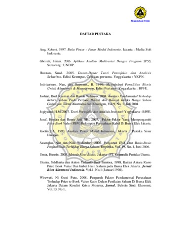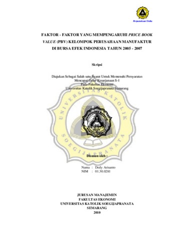 Arisanto, Dedy (2010) FAKTOR - FAKTOR YANG MEMPENGARUHI PRICE BOOK VALUE (PBV) KELOMPOK PERUSAHAAN MANUFAKTUR DI BURSA EFEK INDONESIA TAHUN 2005 - 2007. Other thesis, Prodi Manajemen Unika Soegijpranata.