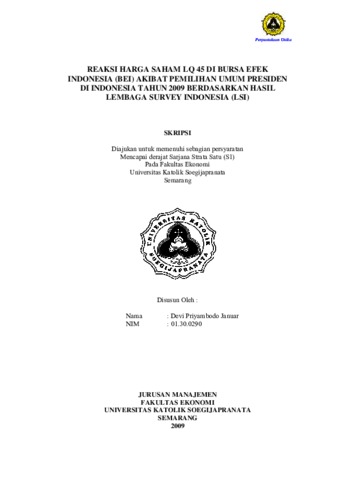 Januar, Devi Priyambodo (2009) REAKSI HARGA SAHAM LQ 45 DI BURSA EFEK INDONESIA (BEI) AKIBAT PEMILIHAN UMUM PRESIDEN DI INDONESIA TAHUN 2009 BERDASARKAN HASIL LEMBAGA SURVEY INDONESIA (LSI). Other thesis, Prodi Manajemen Unika Soegijpranata.
