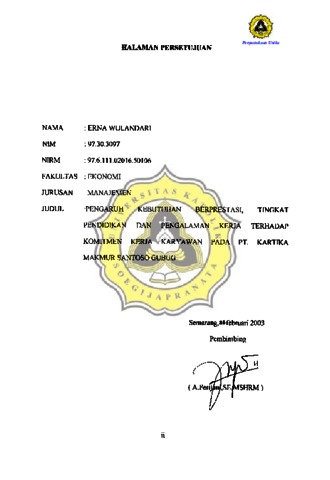 WULANDARI, ERNA (2003) PENGARUH KEBUTUHAN BERPRESTASI, TINGKAT PENDIDIKAN DAN PENGALAMAN KERJA TERHADAP KOMITMEN KERJA KARYAWAN PADA PT.KARTIKA MAKMUR SANTOSSO GUBUG. Other thesis, Prodi Manajemen Unika Soegijapranata.