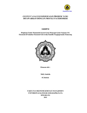 ISABELLA, MELLY (2011) CONTENT ANALYSIS KESESUAIAN PRODUK YANG DITAWARKAN DENGAN PROFILE FACEBOOKER. Other thesis, Prodi Manajemen Unika Soegijapranata.