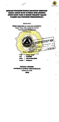 WINOTO, TOMMY (2001) ANALISIS PENGARUH KINERJA KEUANGAN TERHADAP HARGA SAHAM BIASA DI BURSA EFEK JAKARTA (STUDI KASUS PADA 17 EMITEN TERAKTIF DALAM VOLUME DAN FREKUENSI PERDAGANGAN). Other thesis, Prodi Manajemen Unika Soegijapranata.