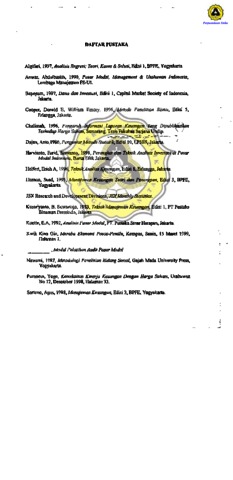 Pasar modal yang bisa berkembang dengan baik akan sangat bermanfaat bagi beibagai pihak scpcrti masyarakat, pemerintah, maupun bagi perusabaan yang meneatatkan sahamnya dipasar modal itu sendiri. Perkembangan suatu pasar modal sangat tergantung pada investor, emiten. dan lembaga-Icmbaga penunjang pasar modal lainnya. Selama ini kondisi harga saham-saham yang tereatal dipa'Wlr modal senantiasa naik turun. Hal tersebut menyebabkan investor menjadi enggan dan kesulitan untuk mcncnlukan pilihan dalam mcnanamkan modalnya apaJagi untuk investor yang tujuan utamanya memperoleh capital gain. Dengan kondisi semacarn iD;i, investor akan merasa bingung menentukan waktu yang tepat untuk melakukan lransaksi. Akibalnya volume perdagangan m nWUD karena pcmodal cenderung mcrasa enggan melakukan transaksi dan pad himya harga saham juga menwun. Dengan menurunnya harga saham akaIb nyebabk urunnya minat investor maupun calon investor untuk m~namka modalny . da investasi merupakan variabel yang pentiDg untuk m-e.mbangkitkan Jcondisi perekononiiSll ang sedang lesu seperti saat inL Untuk mem~tu investor daJam m~rkiIakan h&f!a saham. maka penelitian ini berusaha "I"~uskan m el peramalan dengan men!l,S\!flakan kine~a keuangan sebagai inpu~Sebab-.nil . sebuah saham selalu berkaitan dori'gan perkiraan . preslasi perusahaap-di"" JIlasa depan sedangqlli P\CSIaSi perus"t'aan bi", dikaji dari kinetja keuangan pefDsahaan F g diolal> diDl faPoran keuan!l\" yang dl el uark.n sec"", perindik. Ber~kan enjelasan. di~tas m'l5"lab dalam I1"neliti ini dapat dirumuskan sebagai ikut : apakah ada III!ngar\ih yang signiflkan a t~ra kinerja keuangan yang dihi g mel3lui msio lieu!!!!.!l"" terl)ldip hargll sab~ . Sumber utama .vanabel yan ijadikan dasar UDtuk mc'n'fuiur proyeksi "arga sa? adalah kineJja keuangaD e U en yanj! VI "abelDyli berkaitan Ilnpung deilgan se~ ' ,aham yaitu DER, DPS, EPS, R, ~n. Laporan euangan yang di!JlT1ati adal Deraea dan laporan rug; laba liap ~iten muli};.tahUnt1.9~99,9 de gan alasalV ihwa sekitar tahun tersebut seearn urn kondisi 1nlernal- pe~haan mengalatni pasang surut akibat te~adinya krisis m r sehingga harga sabam bia da perusahaanperusahaan di BEl lebih be ktuasi. ?enelitlan ini bertujua untuk mengukur pengaruh kinerj~ keuangan y ,.....",...", g me 31ui rasLPA'euangan terbadap borga saham seeara bcrsama-sama. &<Iangkan ·RQ .-am penelirian inl dimaksudkan uotuk menguji ada tidaknya pengaruh yang signifikan antara kineJja keuangan yang dihitung melalui rasio keuangan terhadap barga saham. Hipotesis tersebut dirumuskan sebasa; berikut : Ho : Tidal< ada pengaruh yang signifikan antara kine~a keuangan yang dihitung melalui rasio keuangan terbadap harga saham Hi : Ada pengaruh yang signifikan antara kinerja keuangan yang dihitung melalui rasio keuangan terbadap barga sabam Alat · analisis yang digunakan untuk mengctahui ada lidaknya pengaruh yang signitikan antara masing-masing rasio keuangan dengan harga saham adalah an~isis regresL linear berganda. Perhitungan koefisien regresi berganda akan menunjukkan besamya perubahan harea sabam pcnulupan apabila masing-masing rasio keuangart berubah sebesar 1 unit satuannya dan berguna untuk merumuskan model ekonometrik scrta untuk memperkirakan harga saham di masa yang akan datang. Dengan menggunakan program statistik SPSS akan diperoleh koefisien regresi sebagai berikut : a = intercept = 0.372, bI = koefisien regresi DER = -0.002, b1 = koefisien regresi DPS ~ 0.086, b, ~ koefisien regresi EPS ~ 0.015, b. ~ koefisien regresi PER ~ 0.0004, bs ~ koefisien regresi ROE ~ 0.0006 Hasil perhitungan diatas kemudian digunakan untuk merumuskan model ekonomelrik berikut ini : Y = a + hl.XI + b2.Xl + b3.X3 + b4.X4 + b.~.X5 Y ~ 0.372 + (-0.002).x, + 0.086.x, + O.OIS.x, + 0.0004.X. + 0.0006Xs Basil perhitungan koefisien regresi kemudian diuji dengan bantuan uji F ( secara bersama-sama). Hasi1 F hitung = 6.481 > 2.21, menolak Ho dan menerima Hi artinya seeara bersama-sama ada pengaruh yang signifikan antara DER, DPS, EPS, dan ROE terhadap harga saham. Hasil perhitungan statistik dcngan program sLatisLik SPSS akan menghasilkan nilai adjusted R square sebesar 29.08% artinya kelima rasio keuangan secara bersama-sama mempunyai menjelaskan keragaman harga saham sebesar 29.08% sedangkan . oleh faktor-faktor lain diluar kelima rasio keuangan tersebut. Hasil penelitian m'mulDjl~ rne:1alui rasio keuangan pengaruhnya sangat k~:;Zfe:;al~~.~!~~~~; linear bcrganda 11 melihat ha'lii I uji F ) temyata mcmpunyal Selanjutnya sebagai input untuk Square-nya. DaTi dapat diketahui adjusted R square keuangan emiten narnun dipcngarubi eksternal maupun faktor dapa! yang dihitung walaupun regreSl uji F kita ( hasil emiten R . SPss nilai kineIja saham 70.92% baik faktor Ini berarti bahwa dipengaruhi oleh kinerja keuangan emiten tetapi I . oleh faktorfaktor lain yang mempengaruhi emiten maupun faktor internal misalnya kondisi perekonomian internasional yang mempengaruhi pcrckonomian dalam negen. kondisi perekonomian malao. situasi politik: dan perubahan kebijakan IlI'I)I.erintab b/iU< dalarn bidang ekonomi, industri, maupun dunia usaba. Bagi investor yang ingin menentukan pilihan untuk mcnanamkan modal dan juga bagi investor yang jpgin memperoleh capital gain sebaiknya tidak. hanya memperhatikan kinerja' keuangan emiten saja sebab berdasarkan basil penelitian ini terlihat bahwa kinerja keuangan hanya mampu mempengaruhi harga saham sebesar 29.08%. Jadi- disamping melihat kineIja keuangan emiten, investor '13ciln rnempenimbiingkan faklor-faklor lain sebesar 70.92% yang berpengaruh terhadap harga sahain yang dapat mempengaruhi kondisi perusahqlJl1 seperti kondisi .ekOnorni makro, kebijakan-kebijakan pemerintah, serta issue-issue yang berkembang di masyarakat.