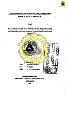 KRISMASTUTI, VERONICA (2001) ANALISIS PENENTUAN PORTOFOLIO DAN PENILAIAN KINERJA PADA SAHAM LQ-45. Other thesis, Prodi Manajemen Unika Soegijapranata.