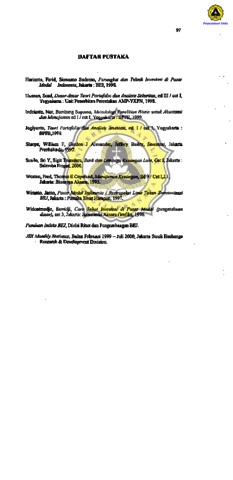 Pasar modal merupakan sarana perusahaan untuk meningkatkan kebutuhan dana jangka panjang. Perusahaan yang membutuhkan dana dapat menjuai surat berharganya di pasar modal. Dengan adany. pasar modal diharapkan dapat menjadi altematif dalam penghirnpooan dana selain perbankan serta memungkinkan bagi pemodal tmtuk melakukan pilihan investasi yang sesuai dengan preferensi risiko mereka Investasi pada saham merupakan salah satu dari investasi yang cukup diperhitungkan investor. Investor yang akan berinvestasi pada saham tentu saja akan mencari saham-saham yang mempunyai return yang sebanding dengan risikonya Saham-saham yang akan menjadi sebaiknya dipilih dari kumpulan sabam unggulan. Yang merup".! .!I;;;I~~r:ft~ adalab sabam yang memiliki likuiditas.u serta prospek pertumbuhan yang adalab 45 saham yang terdaftar dengan likuiditas Dalarn yailu melakukan portofolio berikut : LQ-45 . 1999 sid indeks LQ-45 komisi oplimal dan diharapkan berinvestasi dalam agar dapat lebib pene1iti sendiri pengetahuan yang pengetahuan mengenai {e!!ebut. para sabam ill), biaya Ifll mgm pemodal Bagi ibnu wawasan dan DaJam penelitian ini digunakan off Rate dari IDetode indeks tunggal. Langkab-Iangkab pada pembentnkan portofolio meliputi langkab pertarna perhitungan return realisasi dan return ekspek"tasi dari saham, return realisasi dan return ekspektasi dari pasar, varian dari saham dan pasar , kovarian dan Beta saham, fisiko pasar dan risiko unik: saham Langkah kedua menghihmg Excess Return to Beta (ERB) masing-masing saham, kemudian dibandingkan dengan Cut off Rate indeks tunggal. Saham-saham yang memiliki ERB lebih besar dari saham yang mempunyai ERB di titik C* (cut off point) masuk dalam portofolio. Sahamsaham yang masuk dalam portofolio ini kemudian dieari proporsi dana, return dan risiko portofolionya, setelah itu portofolio tersebut diuji kineIjanya Melalui analisis portofolio optimal untnk sabam-sabam LQ-45 pada tiga periode dapat disirnpulkan basil-hasil sebagai beril..'Ut: Vll ./' Pada periode I : proporsi dana masing-masing ,aham sebagai berikut : RALS 64,75%; KLBF 3,28% dan HMSP 31,97% dengan relurn portofolio 0,2042, varian portofolio 0,0204, dan difforentiol re/urn 0,1363 . ./ Pada periode II : proporsi dana masing-~ing saham sebagai berikut : MEDC 48,35%; LPLl 10,43% dan TLKM 41,22% dengan re/Urn portofolio 0,0775, varian portoColio 0,0192, dan differential return 0.0679 . ./ Pada pcriode III : proporsi dana rnasing-rnasing saham sebagai beril-ut : RALS 61,91% dan SMCB 38,09% dengan re/Um portofol;o 0,0278, varian portofolio 0,0610, dandifJerennal return 0.1439. Hasil amilisis sclanjutnya yaitu pengujian portofolio optimal masing-rnasing periode untuk periode berikulnya adalah ,ebagai berikut : ./' Portofolio optimal periode [ jika letap dipertahankan pad. period. berikutnya maka : pada periode II nghasilkan re/Urn 0,0082 dengan differential rerum 0,0056 dan peljode III menghasilkan return - 0,0012 sebesar deng -- - 0/ return !4-~·S~~ ./ Portofolio opt' .p.\ID0de 11 jQia letap dipert berikutnya mak .... pooa periode IiI mengnasilkan reru~ dengan dijferen/ftll re/Urn ~O 05·18, Dar; hasil analii skata k tfruhan dihlsilkan kesimpulan , porto folio optimal pada suatu periode relurn lenIU !'!Id'Punyai kineti. yang 'k pada periode beri ... PortofoljP optimal polio I menghasilk~eturn sitif jik. portofolio but diportahankan poda , II namun n~re/Urn negatif jika cfj rtahankaii pada period •. Ill. Pada pen ~ ~~anya, portofolio opt" periode ~ men~ liiffoMnIitll return ~itif pad~ periode 11 dan III sedan f' portofo lio optimol pe.!iQde II IJienahisilkan lIijferenllJ return negatifjika Ie cI pertahan\[an podaperiode lII. I Pada peneli \¥\". ini. ; eneliti ct.pI ~mbetiklil JII'IIIo.sarltrJ bahw", .\Vestar yang ingin berinv asi sebaiKnya menm!!rhit~g kan analisiS portot; li6 selama beberapa perio~e tuk melihat~erj II.EOiti ralio' ~ersebu pada per" cte·periode berikuLnya, sellingg !1P~a. pert~apat-melakuKan revisi 1e~ investasi portofolio. investor jugo\p [u mencoba ifmngguffikan data harg. saham dan ILQ- 45 harlan atau mingguan . mengel8hui rata-rata. relurn h ... atau mingguart Selain rnempertimbangkan anatiSis ortofolio optimal erja poJ1ofolio optimal, para investor s am J --mem lInbangkan faktor-faktor ekstemal perusahaan seperti kebijaJ( lab, isu polilik, stabilitas kcamanan. dan persepsi berbeda dari investor lain.
