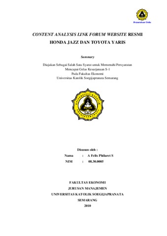 Philaret S, A Felix (2008) CONTENT ANALYSIS LINK FORUM WEBSITE RESMI HONDA JAZZ DAN TOYOTA YARIS. Other thesis, Unika Soegijapranata.