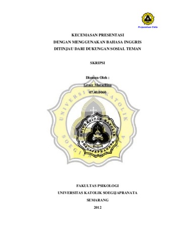 Marsellina, Grace (2011) KECEMASAN PRESENTASI DENGAN MENGGUNAKAN BAHASA INGGRIS DITINJAU DARI DUKUNGAN SOSIAL TEMAN. Other thesis, Prodi Psikologi Unika Soegijapranata.