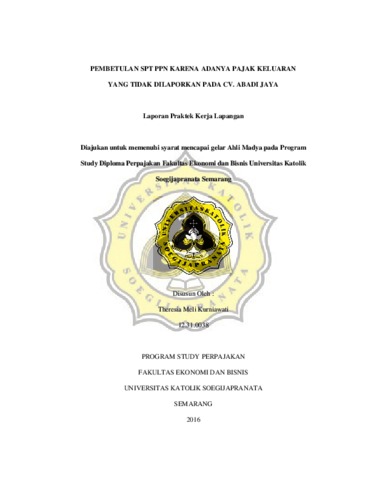 Kurniawati, Theresia Meli (2016) PEMBETULAN SPT PPN KARENA ADANYA PAJAK KELUARAN YANG TIDAK DILAPORKAN PADA CV. ABADI JAYA. Other thesis, Fakultas Ekonomi dan Bisnis UNIKA Soegijapranata.