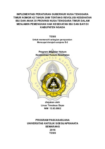 Dopo, Linus Timoteus (2016) IMPLEMENTASI PERATURAN GUBERNUR NUSA TENGGARA TIMUR NOMOR 42 TAHUN 2009 TENTANG REVOLUSI KESEHATAN IBU DAN ANAK DI PROVINSI NUSA TENGGARA TIMUR DALAM MENJAMIN PEMENUHAN HAK KESEHATAN IBU DAN BAYI DI KABUPATEN NGADA. Masters thesis, Magister Hukum Unika Soegijapranata.