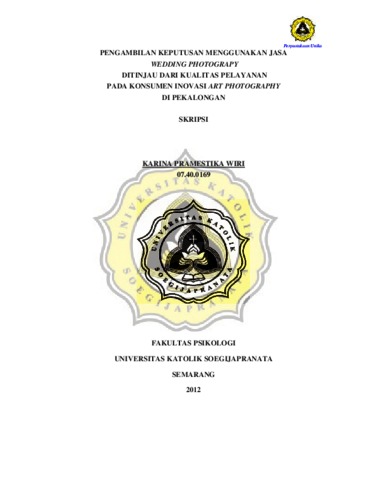 WIRI, KARINA PRAMESTIKA (2012) PENGAMBILAN KEPUTUSAN MENGGUNAKAN JASA WEDDING PHOTOGRAPY DITINJAU DARI KUALITAS PELAYANAN PADA KONSUMEN INOVASI ART PHOTOGRAPHY DI PEKALONGAN. Other thesis, PRODI PSIKOLOGI UNIKA SOEGIJAPRANATA.