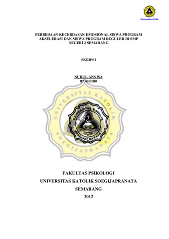 ANNISA, NURUL (2012) PERBEDAAN KECERDASAN EMOSIONAL SISWA PROGRAM AKSELERASI DAN SISWA PROGRAM REGULER DI SMP NEGERI 2 SEMARANG. Other thesis, Prodi Psikologi Unika Soegijapranata.