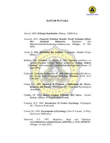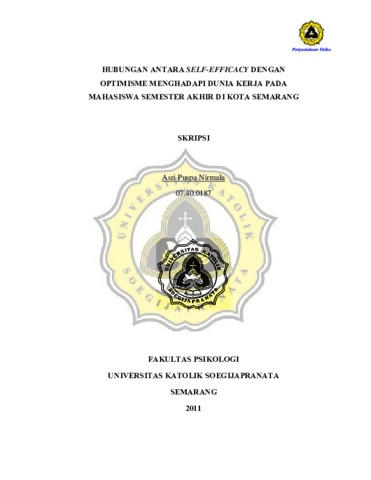 Nirmala, Asri Puspa (2011) HUBUNGAN ANTARA SELF-EFFICACY DENGAN OPTIMISME MENGHADAPI DUNIA KERJA PADA MAHASISWA SEMESTER AKHIR DI KOTA SEMARANG. Other thesis, Prodi Psikologi Unika Soegijapranata.