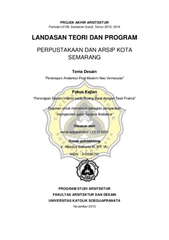 Setyarandini, Venia (2015) LANDASAN TEORI DAN PROGRAM PERPUSTAKAAN DAN ARSIP KOTA SEMARANG Tema Desain “Penerapan Arsitektur Post-Modern Neo Vernacular” Fokus Kajian “Penerapan Desain Interior pada Ruang Baca dengan Teori Fraktal”. Other thesis, Fakultas Arsitektur Dan Desain.
